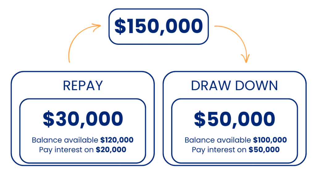 “Think of a $50,000 overdraft. Instead of being handed the full $50,000 upfront and making fixed repayments, the limit simply sits there ready to use. You might draw down $20,000 today to buy stock, and the funds appear instantly in your business account. You only pay interest on the amount you’ve withdrawn — not the entire limit.”