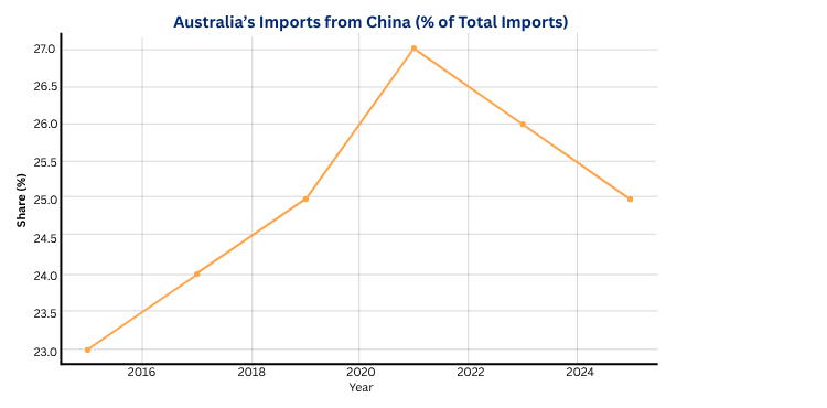 China is Australia’s largest source of imported goods, consistently making up more than 25% of Australia’s total imports over the last decade. According to data from the Australian Bureau of Statistics (ABS), the value of imports from China regularly exceeds $100 billion annually, spanning categories such as telecommunications equipment, clothing and footwear, medical devices, furniture, and industrial machinery.